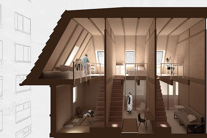Accommodation prices has risen to a point where, only academic families with 1-2 children, are able to afford the apartments. This is a contradiction to the general belief; that the foundation of a healthy city - is a diverse user group. Therefore, I want my project to be a study in socio-economic ways of living together multiple people under one roof. By viewing the private and public; not as clear divisions - but rather as layered constellations of functions and social dynamics. The goal was to extend the phenomenological perception of ‘home’, from the private bedroom to the collective space, through a series of porous screens.