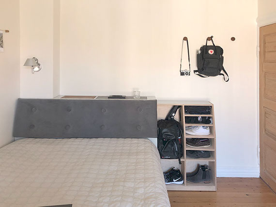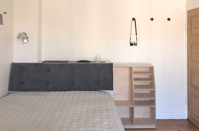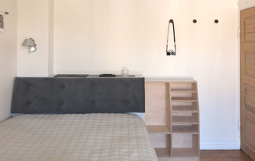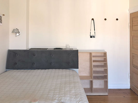 I therefore designed a costume furniture piece to solve both the vacant space and my functional dwelling needs. The unit functions both as a cushioned headboard, laundry-basket, shelf, and storage unit.