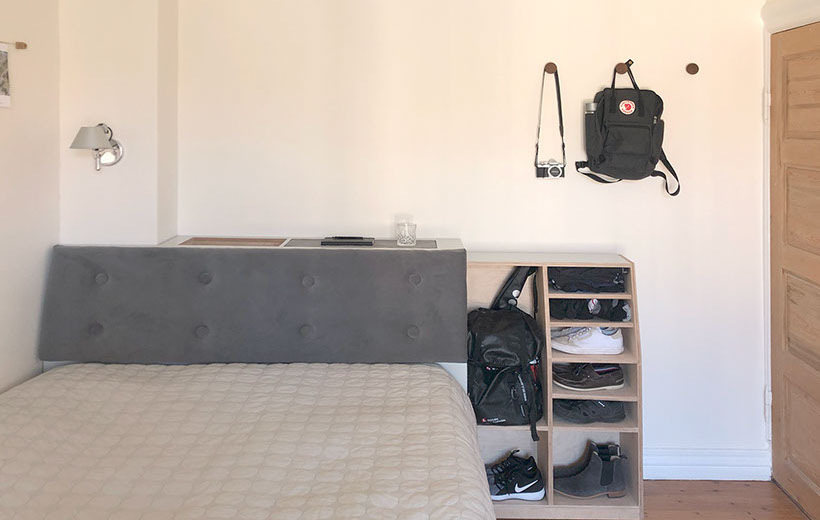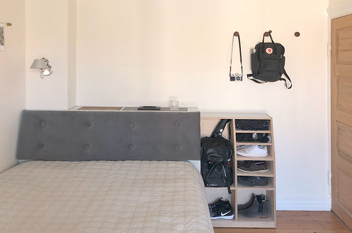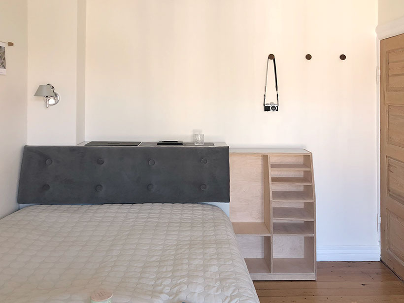 As an undergraduate student I sought to optimize the limited space of my bedroom with a built-in storage unit. It being an old apartment, previously heated with a fireplace, meant that the existing chimney was still present in the corner of the room. This made the placement of the twin-bed difficult, as the small size of the room required the bed being placed flush with two of the walls to allow for circulation in the room. The chimney however made it impossible and a vacant space was left between the bed, wall and chimney.
