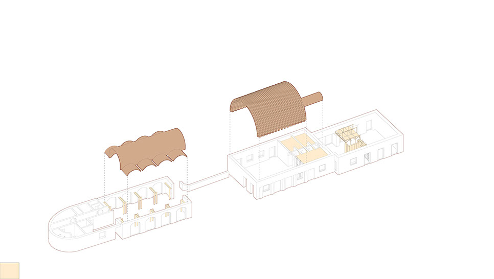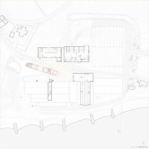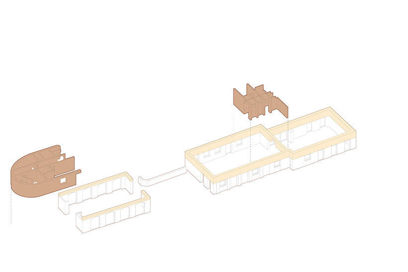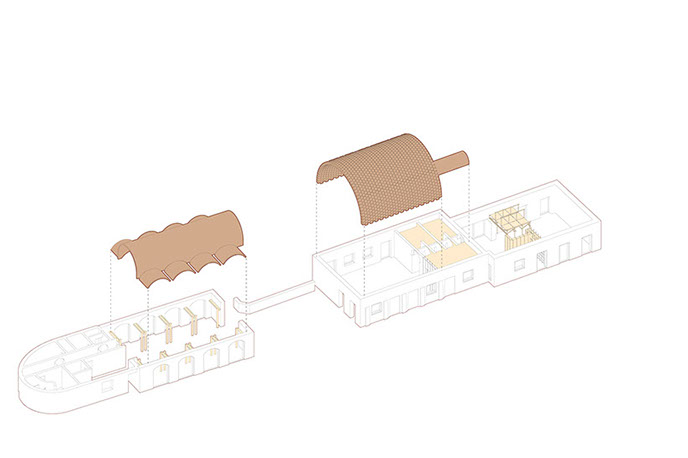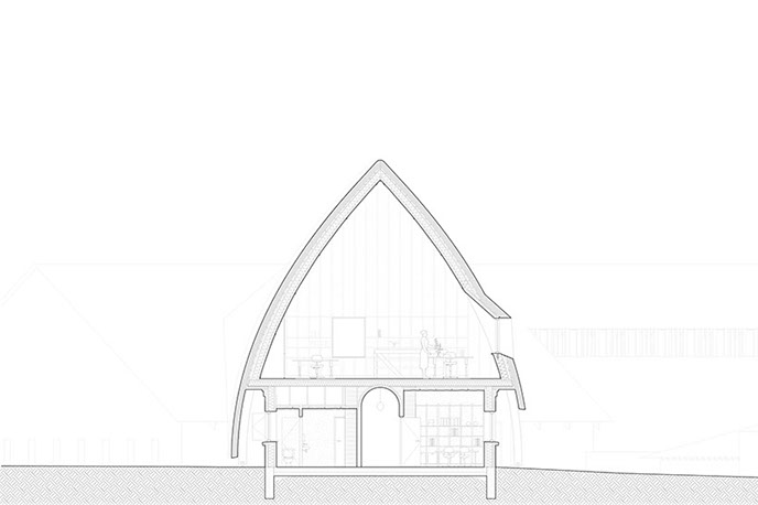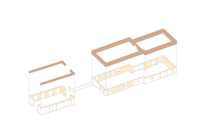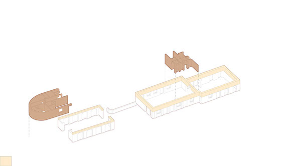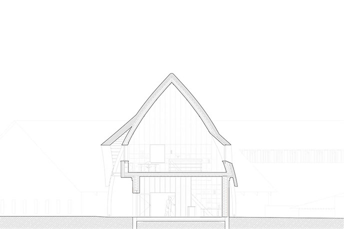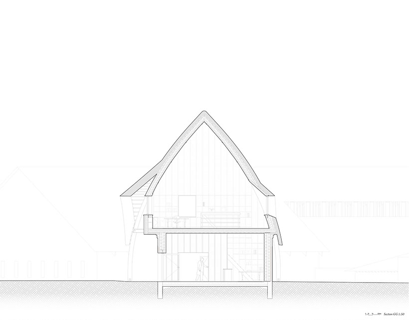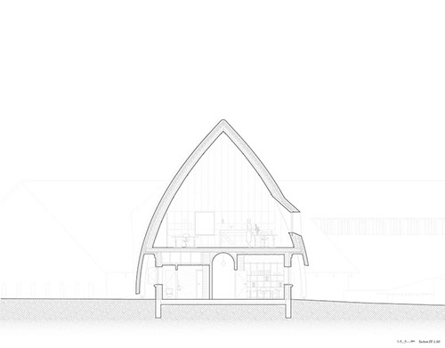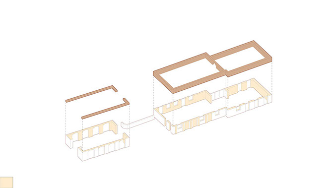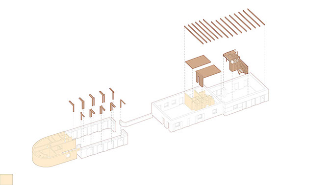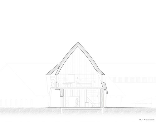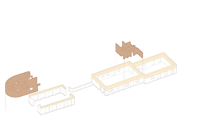 The former administration and service building is transformed to accommodate a new extended program. The existing rhythmic brick facades are preserved while the interior walls are replaced, and the exterior walls insulated. By using renewable building materials, the spaces are curated according to the functional requirements. Some rooms have large spans and are open, while others are compressed and heavy. The new layers in the building support the spatial progression through the building and create entirely new experiences. Likewise, the new thatch roof creates niches, openings, and new in-between zones between indoors and outdoors.