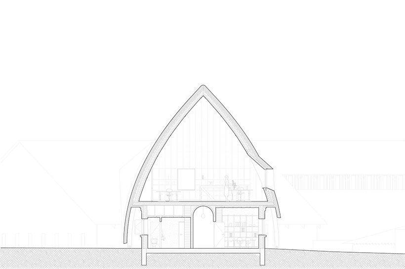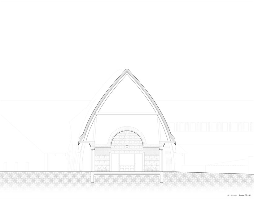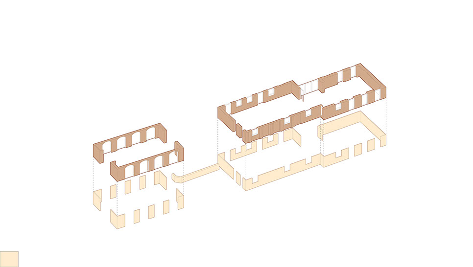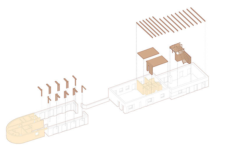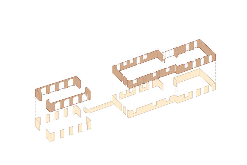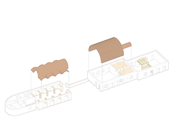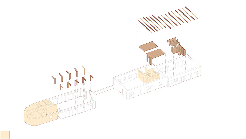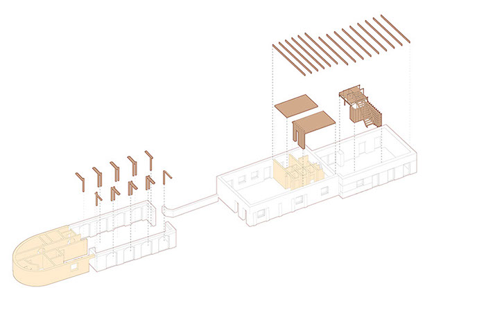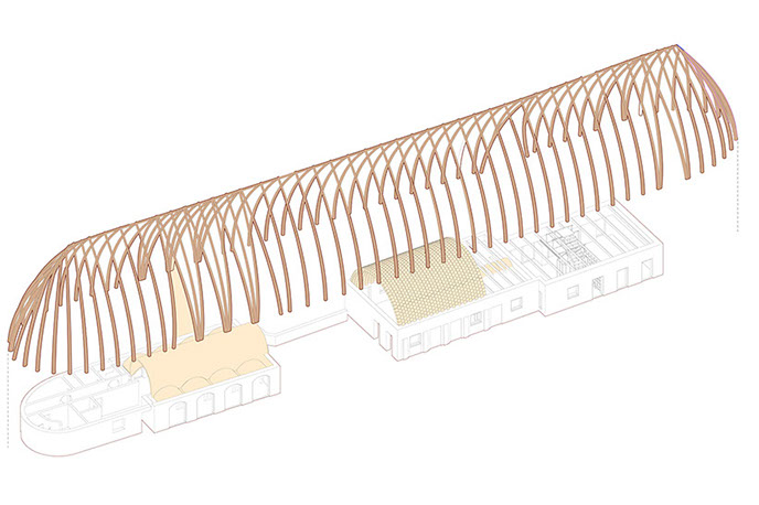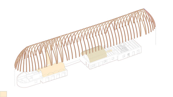 The former administration and service building is transformed to accommodate a new extended program. The existing rhythmic brick facades are preserved while the interior walls are replaced, and the exterior walls insulated. By using renewable building materials, the spaces are curated according to the functional requirements. Some rooms have large spans and are open, while others are compressed and heavy. The new layers in the building support the spatial progression through the building and create entirely new experiences. Likewise, the new thatch roof creates niches, openings, and new in-between zones between indoors and outdoors.