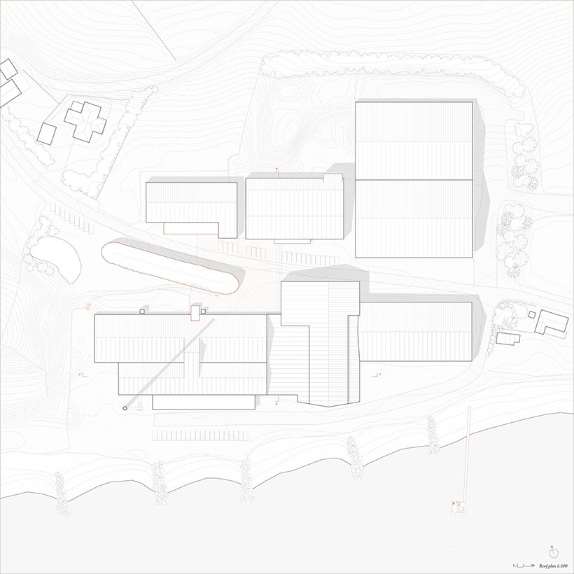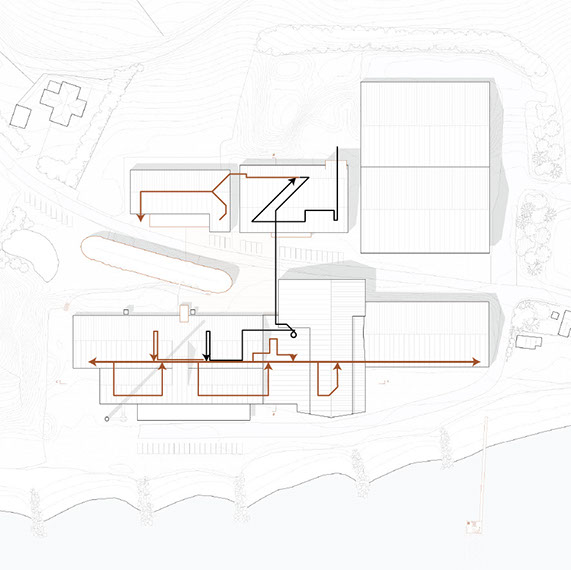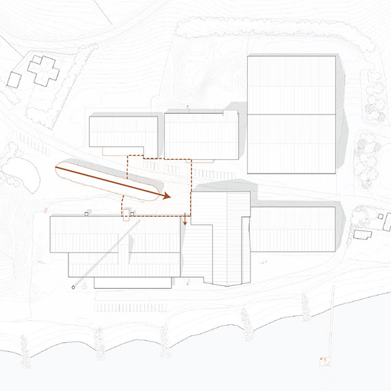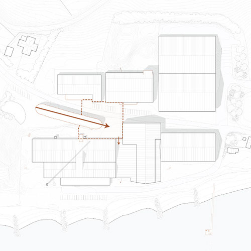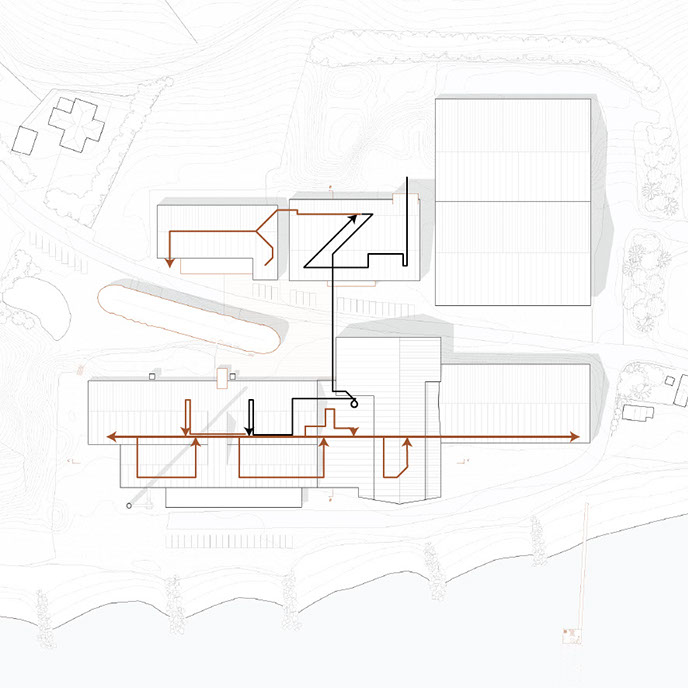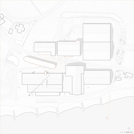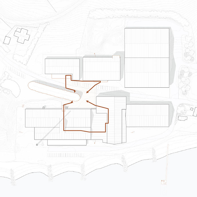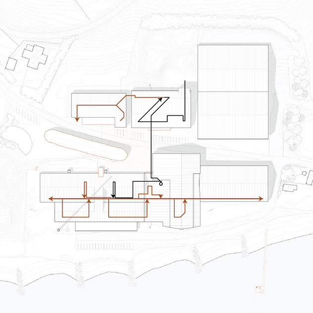 A public loop is introduced through the building complex, giving visitors access to see the production. On the north side, the rough processing can be viewed from the outside and in. In the southern complex, walkways and viewpoints are introduced as a new layer, raised above production.