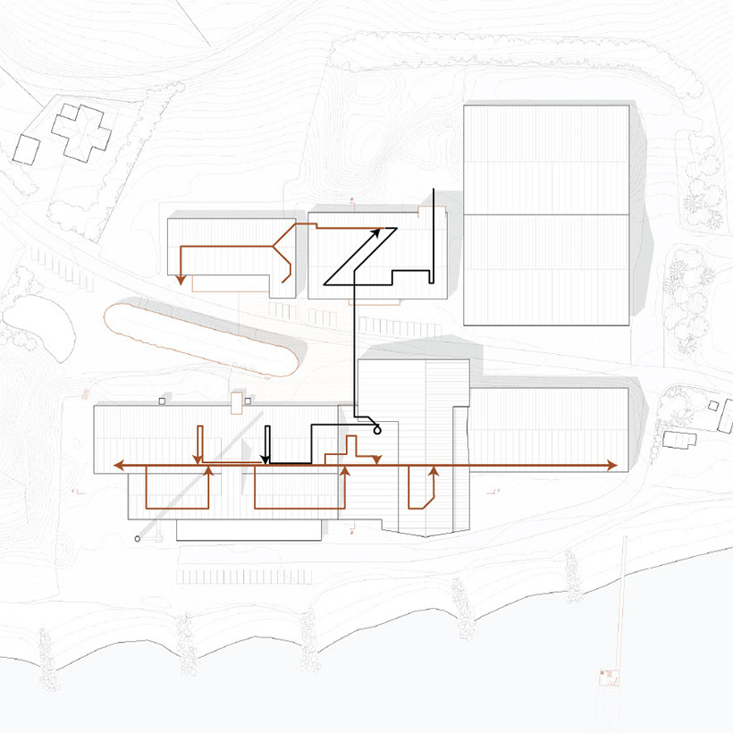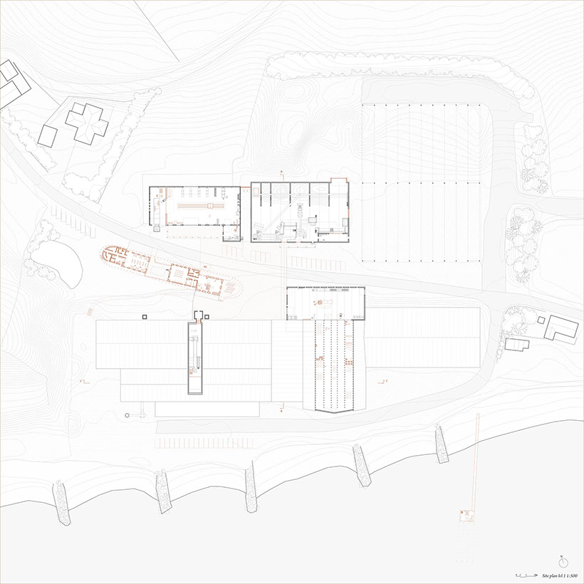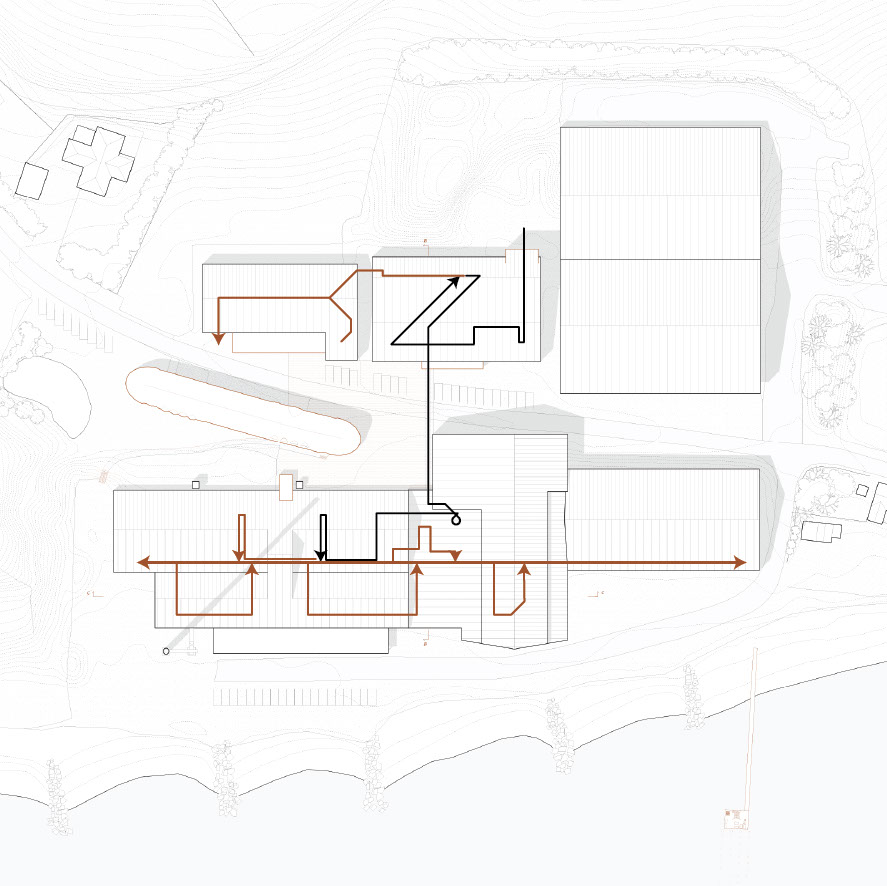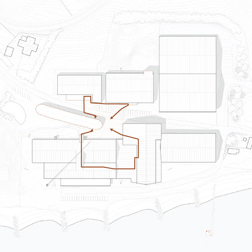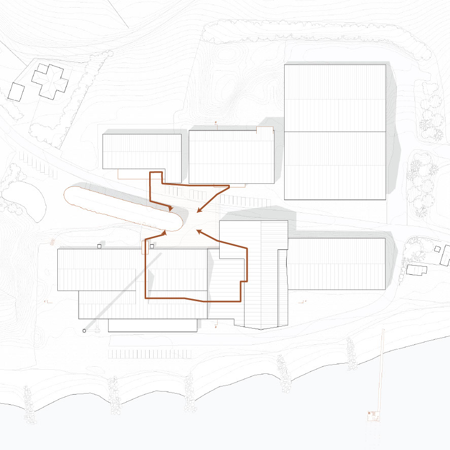 A public loop is introduced through the building complex, giving visitors access to see the production. On the north side, the rough processing can be viewed from the outside and in. In the southern complex, walkways and viewpoints are introduced as a new layer, raised above production.