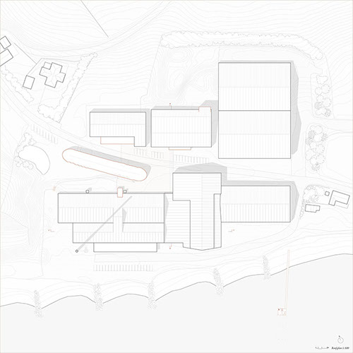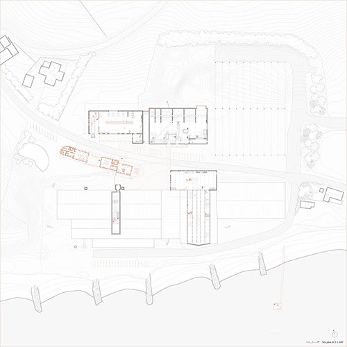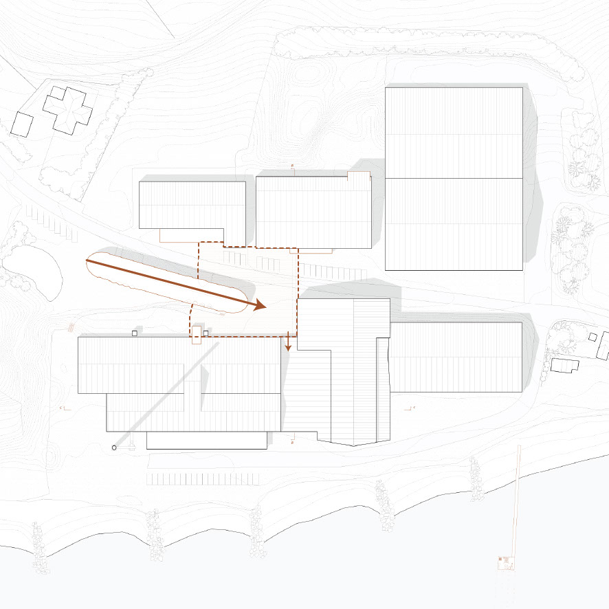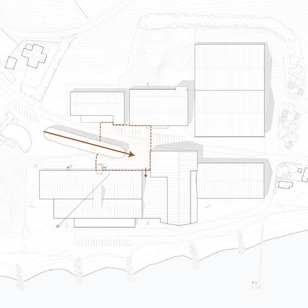 The existing administration buildings articulate with their skewed placement a secondary axis, which is reinforced in the transformed building. A new square is established in front of the new administration, which binds the existing complex together.